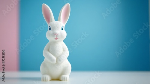 Obraz premium Realistic white ceramic rabbit figurine standing on a smooth turquoise...