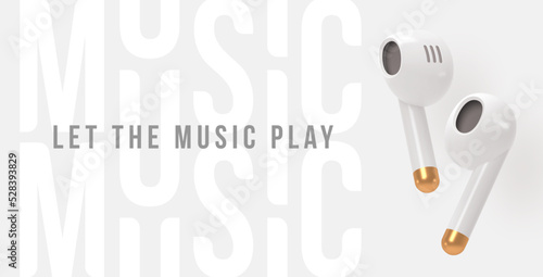 © sergo77, Fototapeta premium Realistic white portable wireless headphones with golden elements. 3d render wireless Earbuds. Let the music play vector illustration.