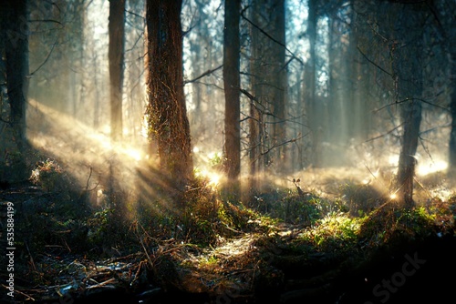 © Ecleposs, Fototapeta premium Realistic woods landscape 3D illustration with copy space and high trees and vast environment