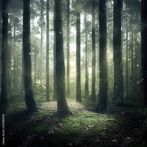 © Ecleposs, Obraz premium Realistic woods landscape 3D illustration with copy space and high trees and vast environment