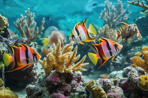© ming, Fototapeta premium realistics fish gracefully dance among coral, displaying their vivid hues, graceful motions, and symbiotic relationship they share with their coral habitats