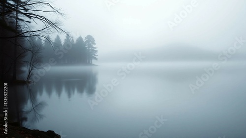 Fototapeta premium Realistics misty lakeside scene exhibits a serene atmosphere with calm waters a misty ambiance and a