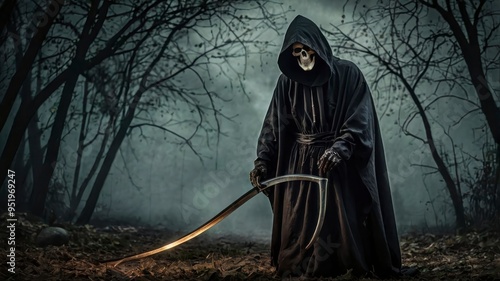 © Saad, Fototapeta premium Reaper with scythe and mobile, spooky image
