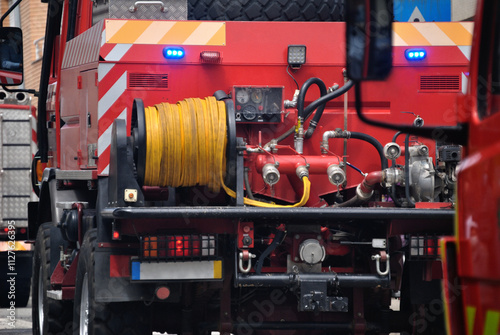 Fototapeta premium Rear of fire engines on an emergency mission, in a city's capital, saving...