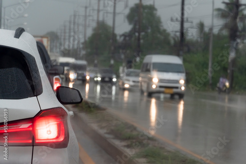© thongchainak, Fototapeta premium Rear sid of white car on the road with blurred of brake light. Wet road conditions during rainy season. Blurred image of a car on the opposite lens with lights on.
