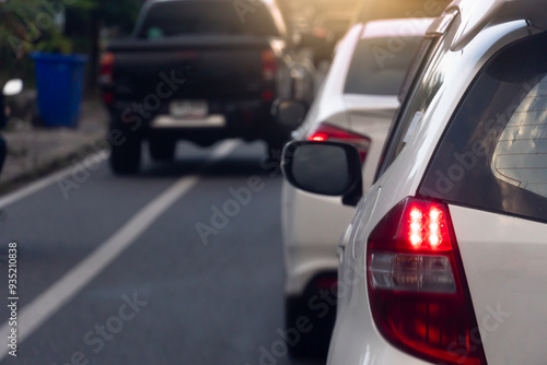 © thongchainak, Fototapeta premium Rear side view of white car on the aspahlt road. Transtport of car turn on brake light in the business time environment of moring time. Traffic congestion and queues of cars.