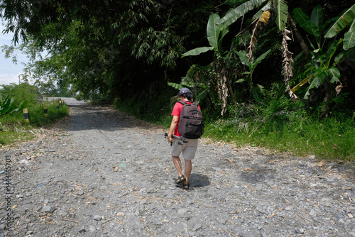 © Bunda, Obraz premium Rear view: A woman with a backpack and camera gear walks down a rocky path surrounded by dense greenery on a sunny day