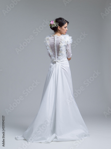 Fototapeta premium Rear view of a beautiful young woman in a wedding dress