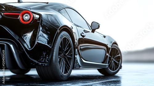 © Mahmud, Fototapeta premium Rear view of a black sports car showcasing sleek aerodynamics, polished dual exhaust, and intricate detailing of wheels. A modern luxury vehicle on a white background.