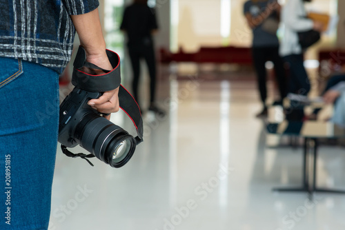 © supong32, Fototapeta premium Rear view of a female photographer with a modern DSLR camera in her hand against a blurred crowded street