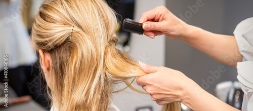 Naklejka premium Rear View of a hairdresser combs blonde hair of the young woman in a beauty...