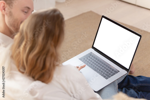 © Rithor, Fototapeta premium Rear view of a happy young married couple with a big white dog watching laptop with white screen in search of a suitable travel agency for a summer holiday