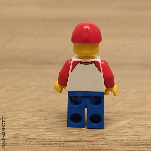 © Everyday Frame, Fototapeta premium Rear view of a Lego figure wearing a red cap and white shirt, representing childhood memories and play