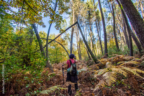 © Nanci, Naklejka premium Rear View Of A Senior Woman Walking In The Forest.Woman In The Middle Of The Forest Contemplating The Beauty Of Nature, She Is Taking A Photo With The Smartphone.Active Woman Doing A Route On A Trail.