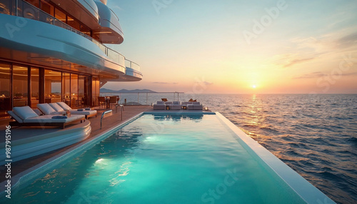Fototapeta premium Rear view of a superyacht with an elegant pool at sunset, exuding opulence...
