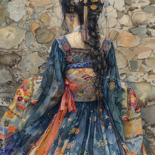 © Mind, Fototapeta premium Rear view of a woman in ornate traditional Asian dress, showcasing intricate embroidery and colorful patterns against a stone wall.