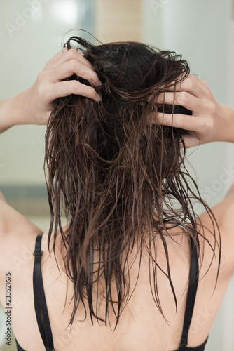 Naklejka premium Rear view of a young asian woman with wet hair after showering.