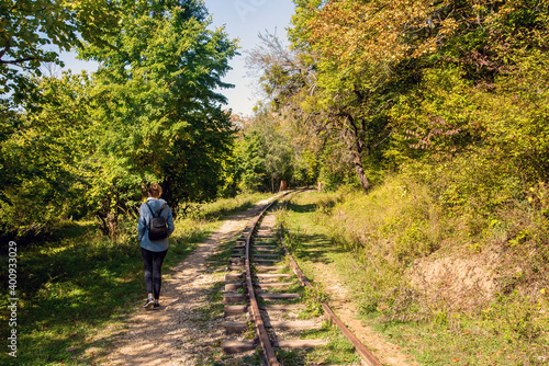 © rostovdriver, Naklejka premium Rear view of a young hiking tourist girl enjoying amazing beauty of nature. Excursion on old narrow railroad in forest