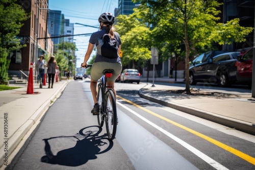 © Iftikhar alam, Obraz premium Rear view of a young woman riding a bicycle in the city, A person zipping through a dedicated bike lane on a stylish electric bicycle, AI Generated