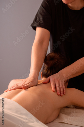 © Katrin_Primak, Fototapeta premium Rear view of an unrecognizable woman receiving a therapeutic massage from a masseuse applying pressure with her hands on his back.