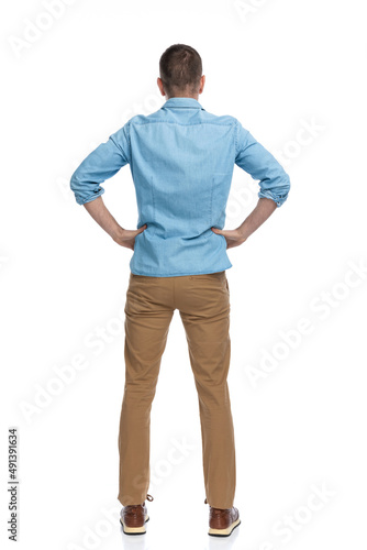 Fototapeta premium rear view of casual man with hands on hips standing