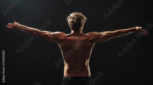© Sasint, Obraz premium Rear view of healthy muscular young man with his arms stretched out isolated on black background