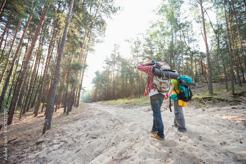 Obraz premium Rear view of hiking couple holding hands while walking in forest