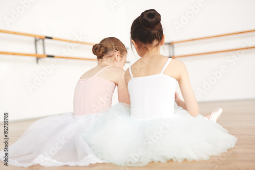 Fototapeta premium Rear view of little ballerinas having rest on the floor between classes of dancing