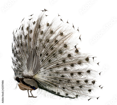 © Eric Isselée, Obraz premium Rear view of Male Indian Peafowl displaying tail feathers