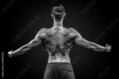 © nazarovsergey, Naklejka premium Rear view of muscular man with his arms stretched out