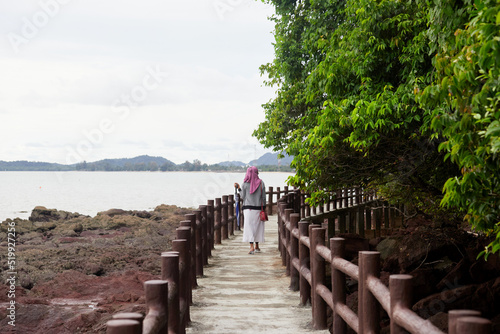 © Anucha, Fototapeta premium Rear view of muslim woman wearing hijab fashion walking on walkway concrete at the island