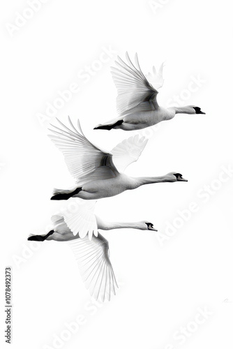 © ebhanu, Obraz premium Rear view of 3 swans in flight. Minimalist composition with copyspace.