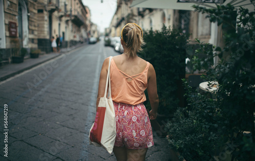 © yossarian6, Naklejka premium Rear view of travel woman on a street walk