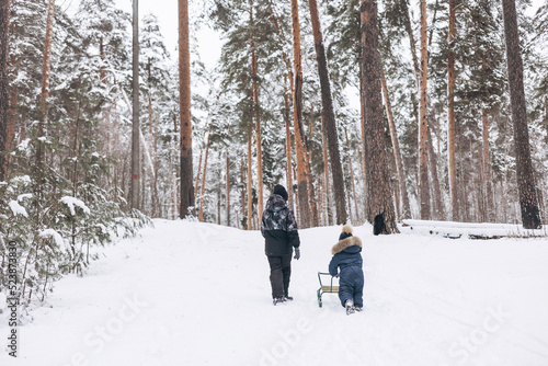 © Lyubov, Naklejka premium Rear view of two boys sledding and having fun together. Happy children playing in snow in winter forest. Brothers spending time together