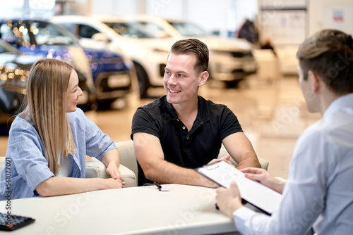 © Roman, Fototapeta premium rear view on confident male manager talking to clients, explaining rules for buying car, happy married family couple sit listening to consultant, have talk discussion. in modern car dealership