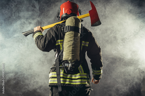 © alfa27, Fototapeta premium rear view on fire fighter stand holding hammer isolated over smoky background, wearing red helmet