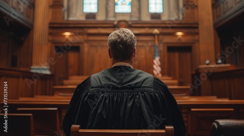 Naklejka premium Rear view photo of man, judge in black robe sitting in empty courtroom and...