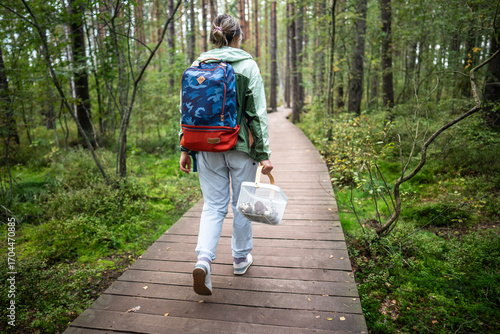 Fototapeta premium Rearview woman forager moving along marked nature path in wetland woodland carrying harvest basket during quiet outdoor excursion. Mushroom hunting on eco friendly trail, sustainable forest tourism