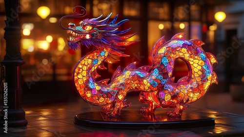 Fototapeta premium reate a photorealistic 3D render of a dragon-shaped salon lamp, adorned with vibrant neon psychedelic jewels, emphasizing the interplay of light and shadow on its multifaceted surface