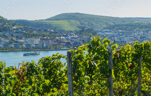 Fototapeta premium Reben vor Blick auf Rhein mit Schiff Ausflugsschiff