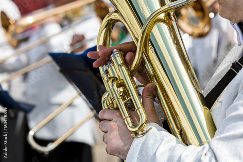 © Mr Twister, Obraz premium ręce muzyk mężczyzna, trzymając dużą tubę na niewyraźne tło orkiestry