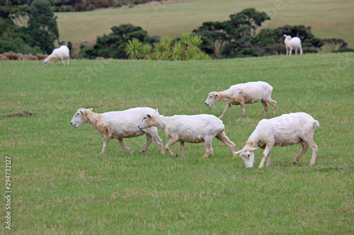 © Luciernaga, Fototapeta premium recently sheared sheeps on a meadow