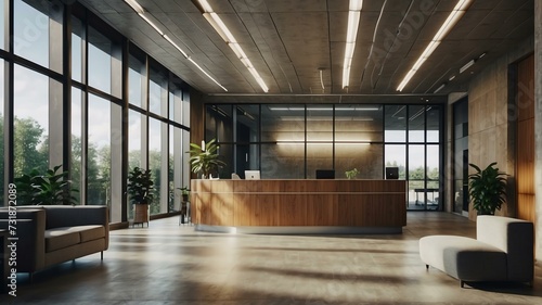 Fototapeta premium Reception area of a tech professional office space building with sunlight...