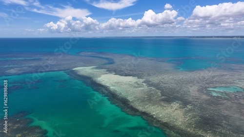 © bydronevideos, Obraz premium Recife De Fora Marine Park In Porto Seguro Bahia Brazil. Stunning Tropical Coastline Beach Scene Viewed From Above. Coast Clouds Seaside Summertime. Outdoors Seaside Scenic Coastline.
