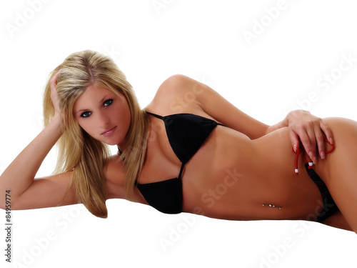 © jeffwqc, Obraz premium Reclining Caucasian Blond Woman In Black Bikini