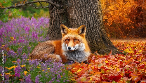 © Future Vision, Fototapeta premium Reclining red fox lying among purple wildflowers, orange leaves on forest floor, with tree trunk