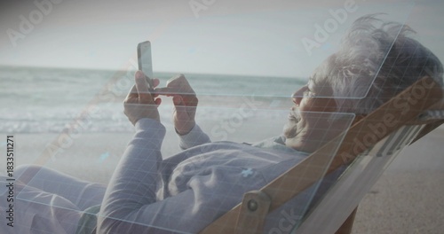 © vectorfusionart, Obraz premium Reclining senior woman using smartphone on deckchair at shore in gray top, blue-overlay, copy space