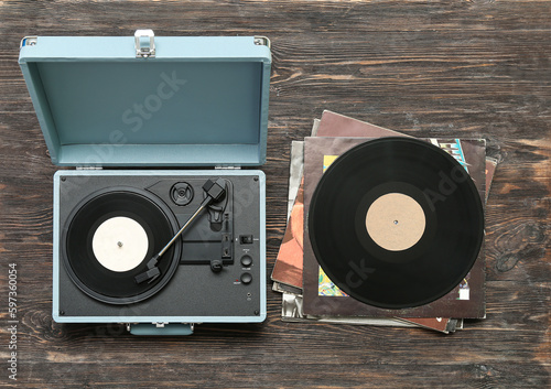 © Pixel-Shot, Obraz premium Record player with vinyl disks on dark wooden background