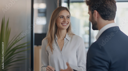 © Nelson, Fototapeta premium Recruiter Shares Job Offer With Candidate in Modern Office Setting
