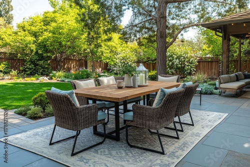 © JIALU, Obraz premium Rectangular acacia wood table with black steel frame, dark brown wicker chairs and light blue armchairs in a serene spring garden setting.